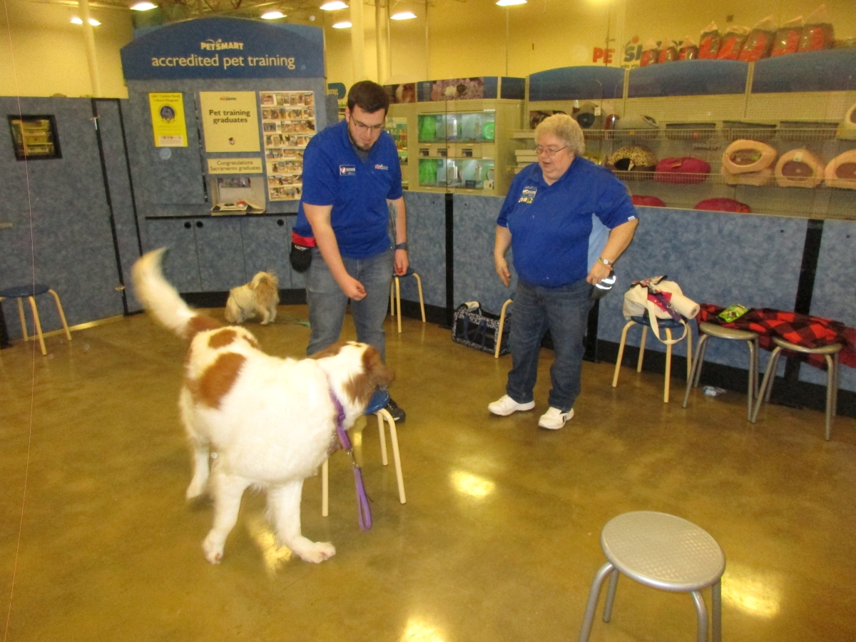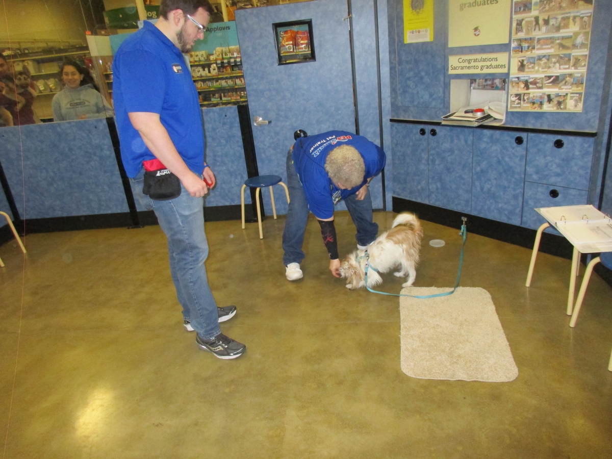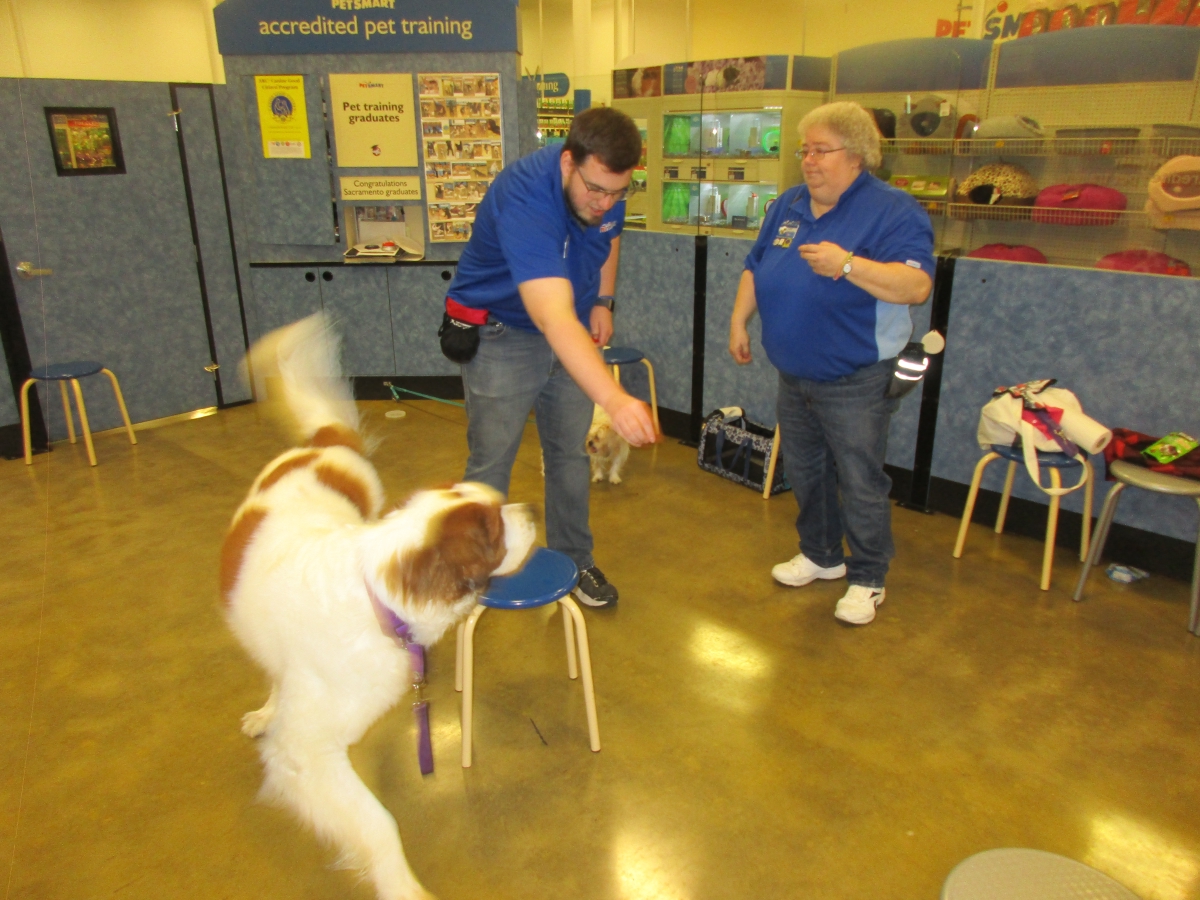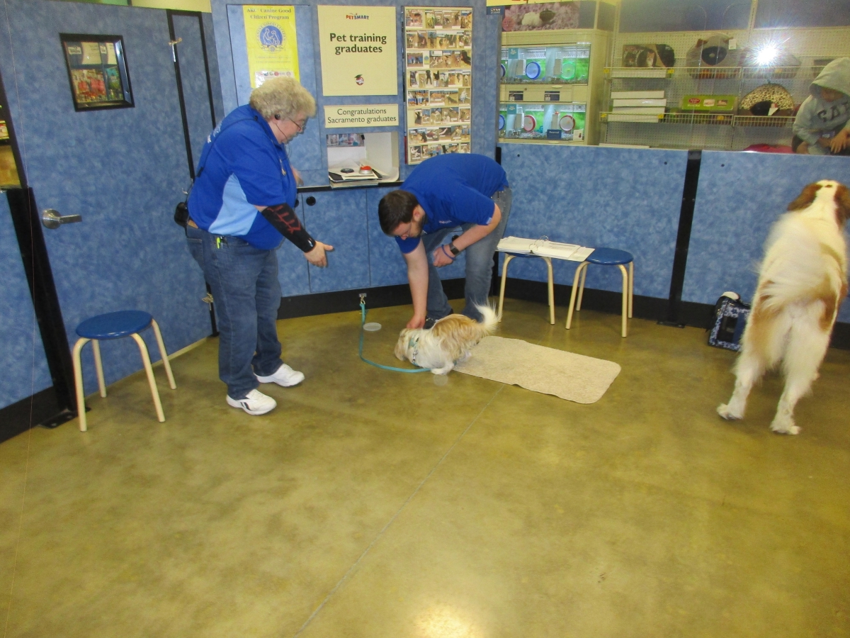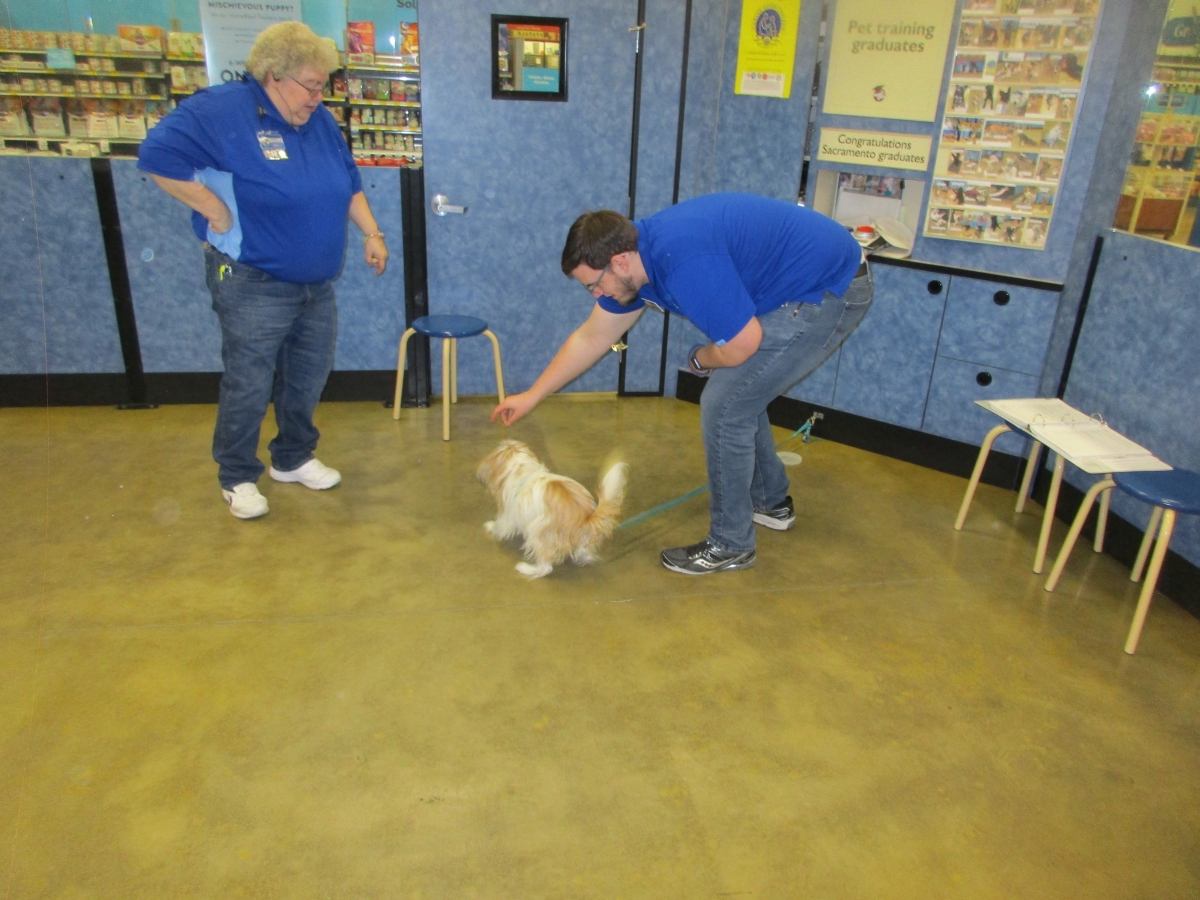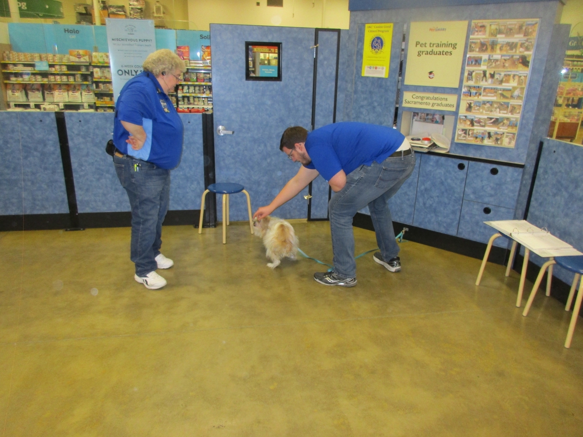 Penny helps Jamie's training of Conner, a new trainer from the Elk Grove Petsmart, in the proper way to train a Click-&-Trick class of pet owners and their dogs...