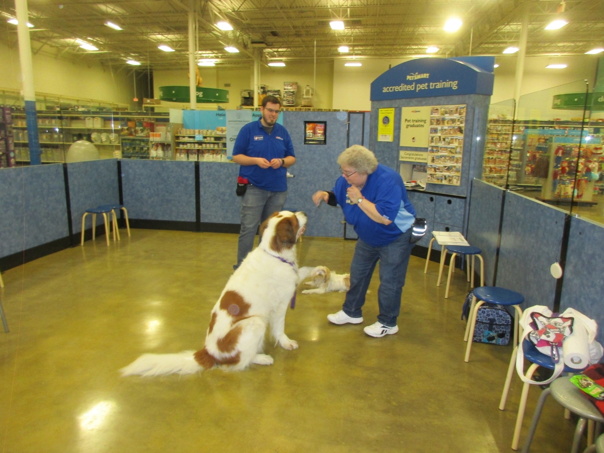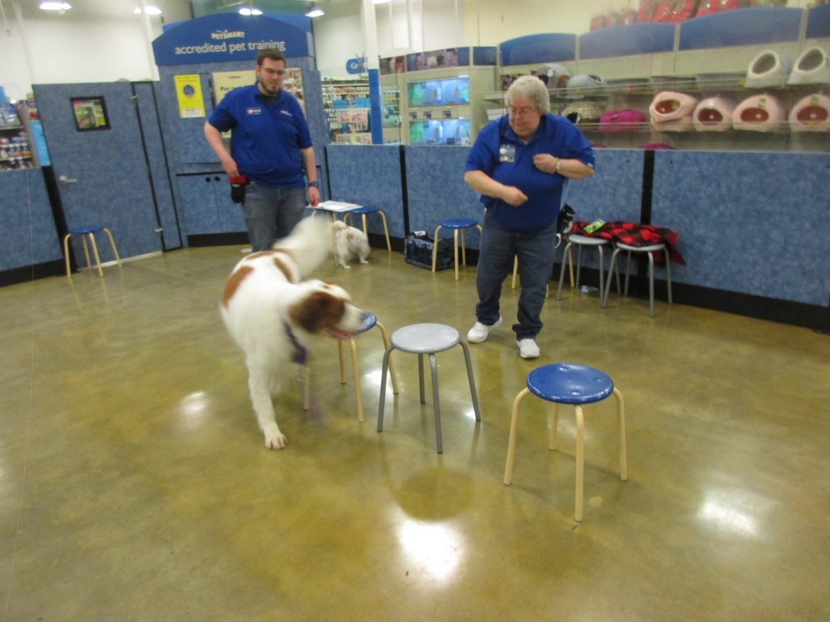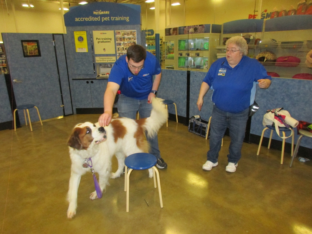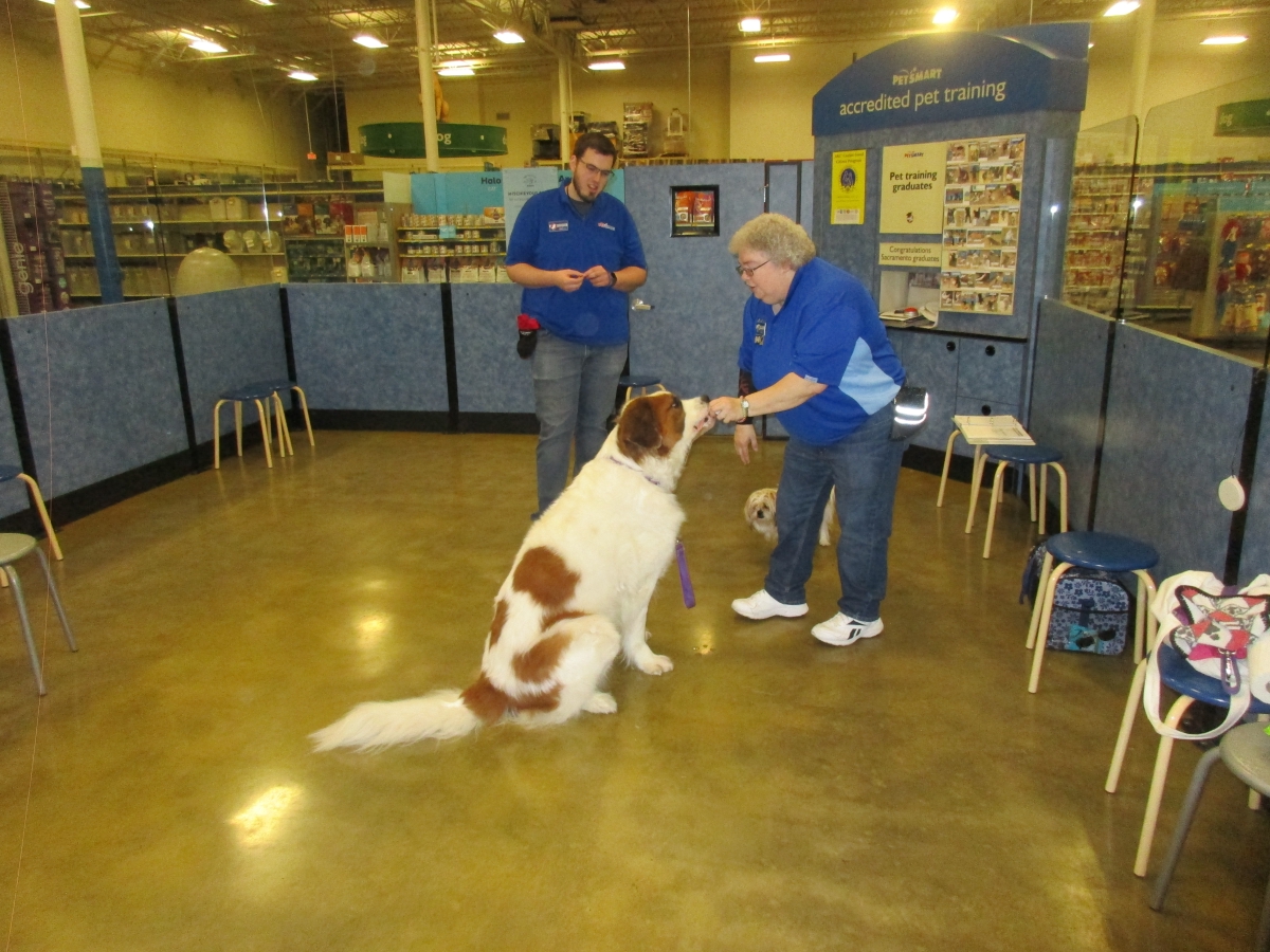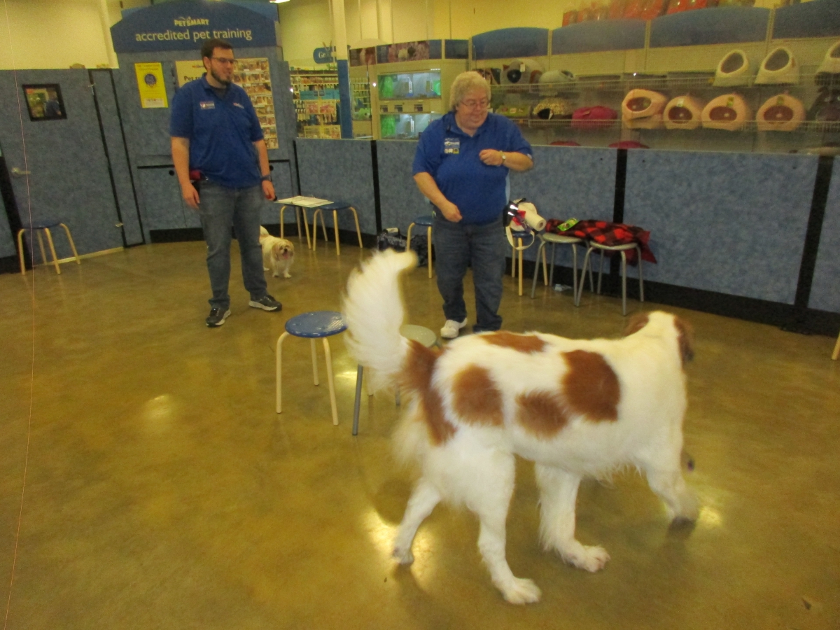 Penny helps Jamie's training of Conner, a new trainer from the Elk Grove Petsmart, in the proper way to train a Click-&-Trick class of pet owners and their dogs...