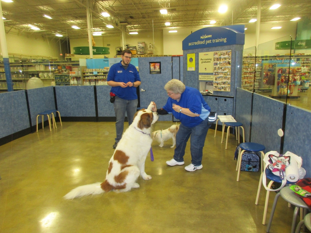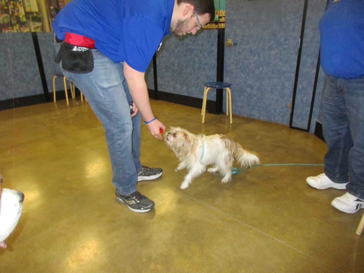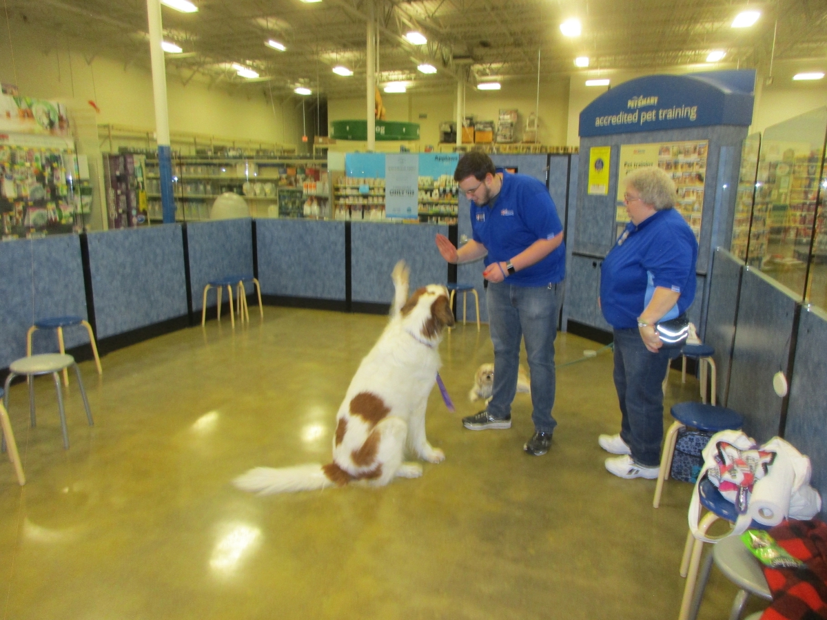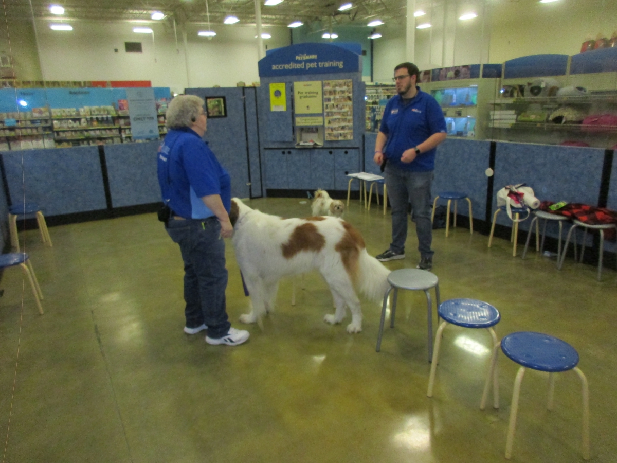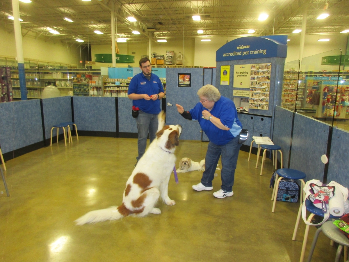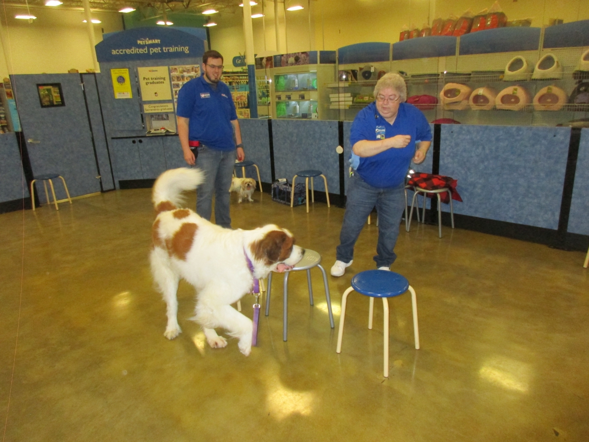 Penny helps Jamie's training of Conner, a new trainer from the Elk Grove Petsmart, in the proper way to train a Click-&-Trick class of pet owners and their dogs...