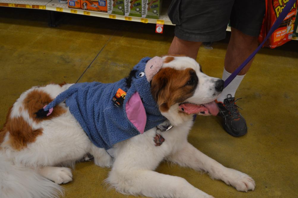 04AUG15/Tuesday/8:00 PM... PETSMART Penny is "stimulus dog" for a dog that is to be tested... ... owner's car died... some other time perhaps... in the meantime Penny models the XL Eore jacket... think she needs the XXXXXXL...