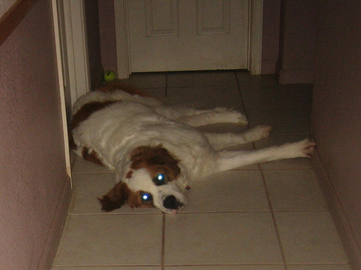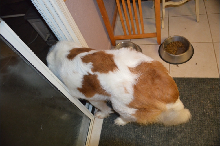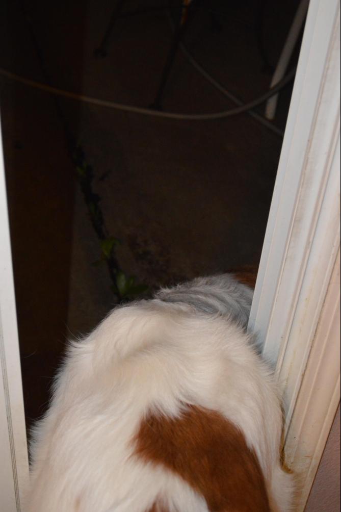 11DEC14/Thursday night... RAIN!!!... Penny keeps going to the door... wants to go out and get a drink, but, does not want to get wet... so... stand inside and stick her head out far enough to reach the spigot...