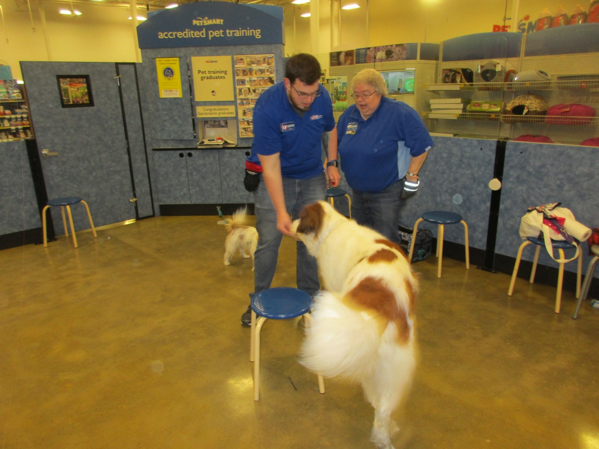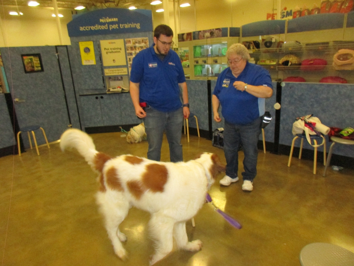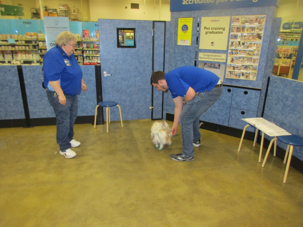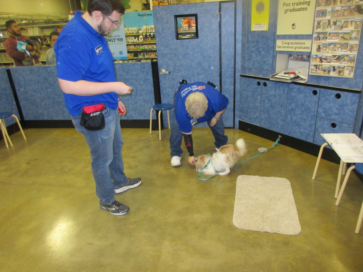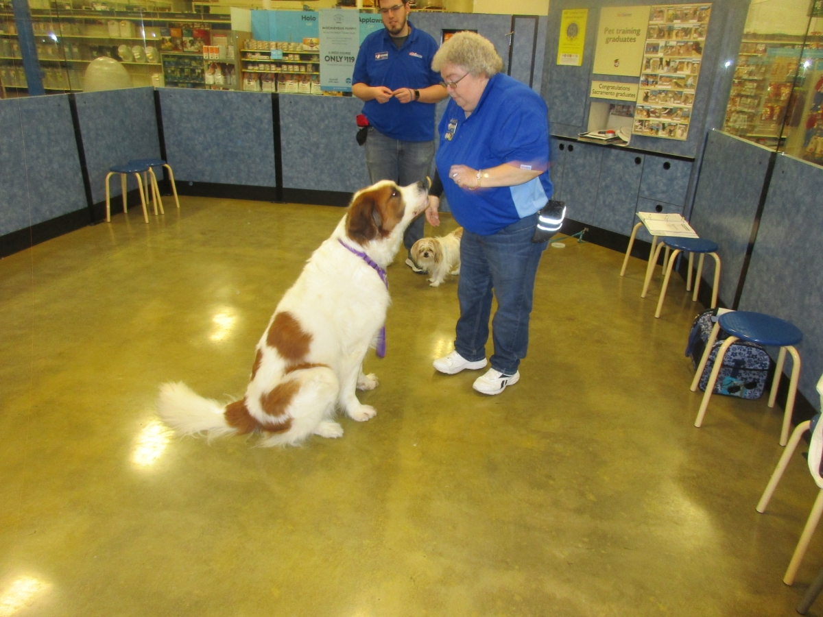 Penny helps Jamie's training of Conner, a new trainer from the Elk Grove Petsmart, in the proper way to train a Click-&-Trick class of pet owners and their dogs...