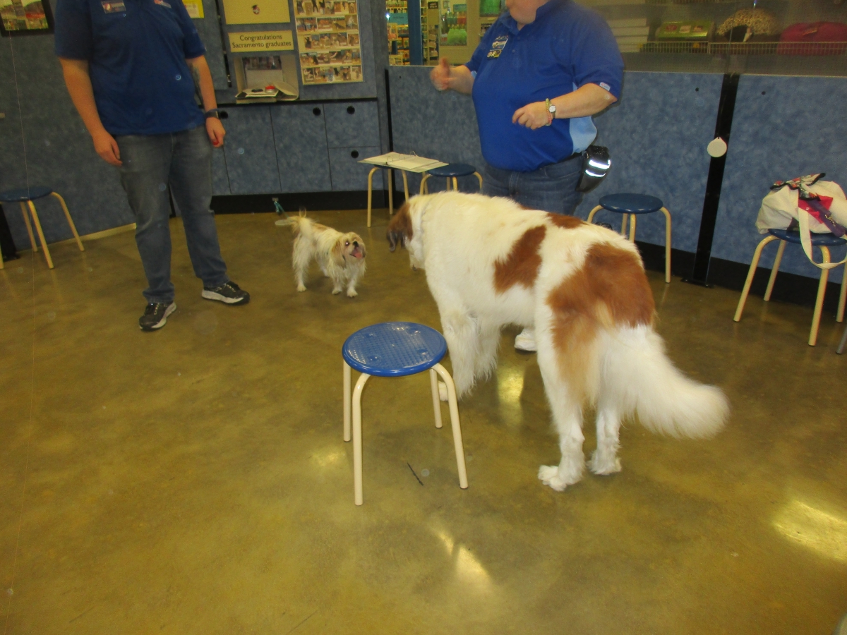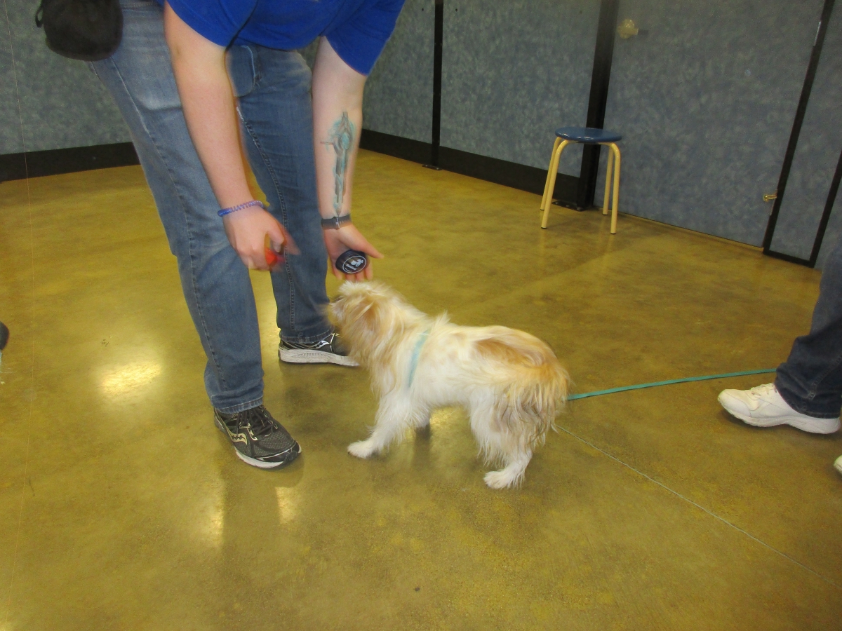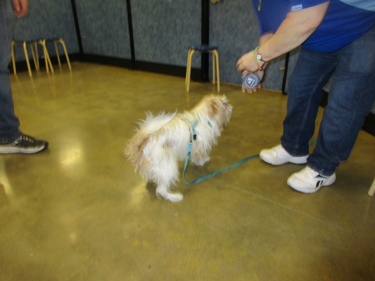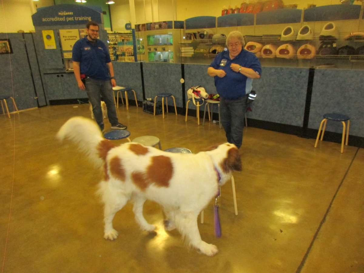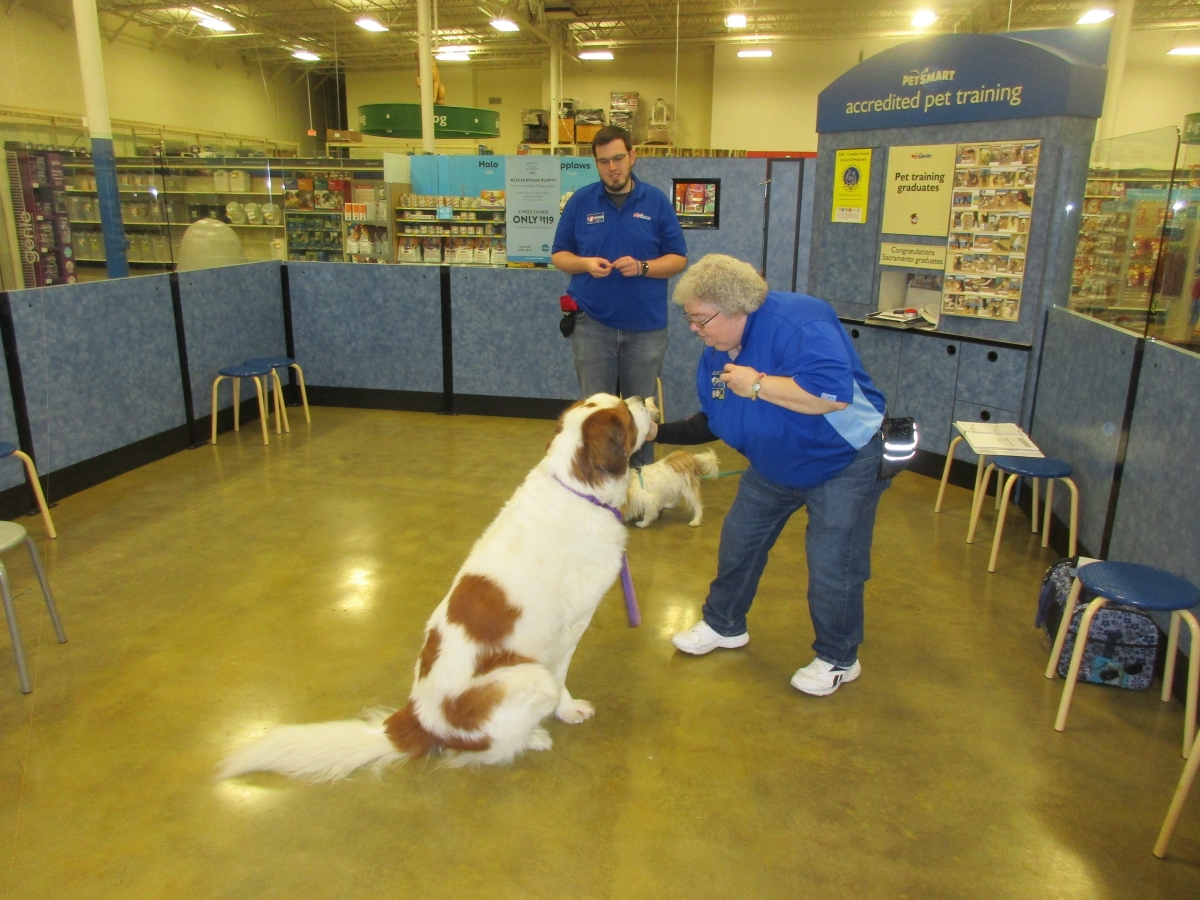 Penny helps Jamie's training of Conner, a new trainer from the Elk Grove Petsmart, in the proper way to train a Click-&-Trick class of pet owners and their dogs...