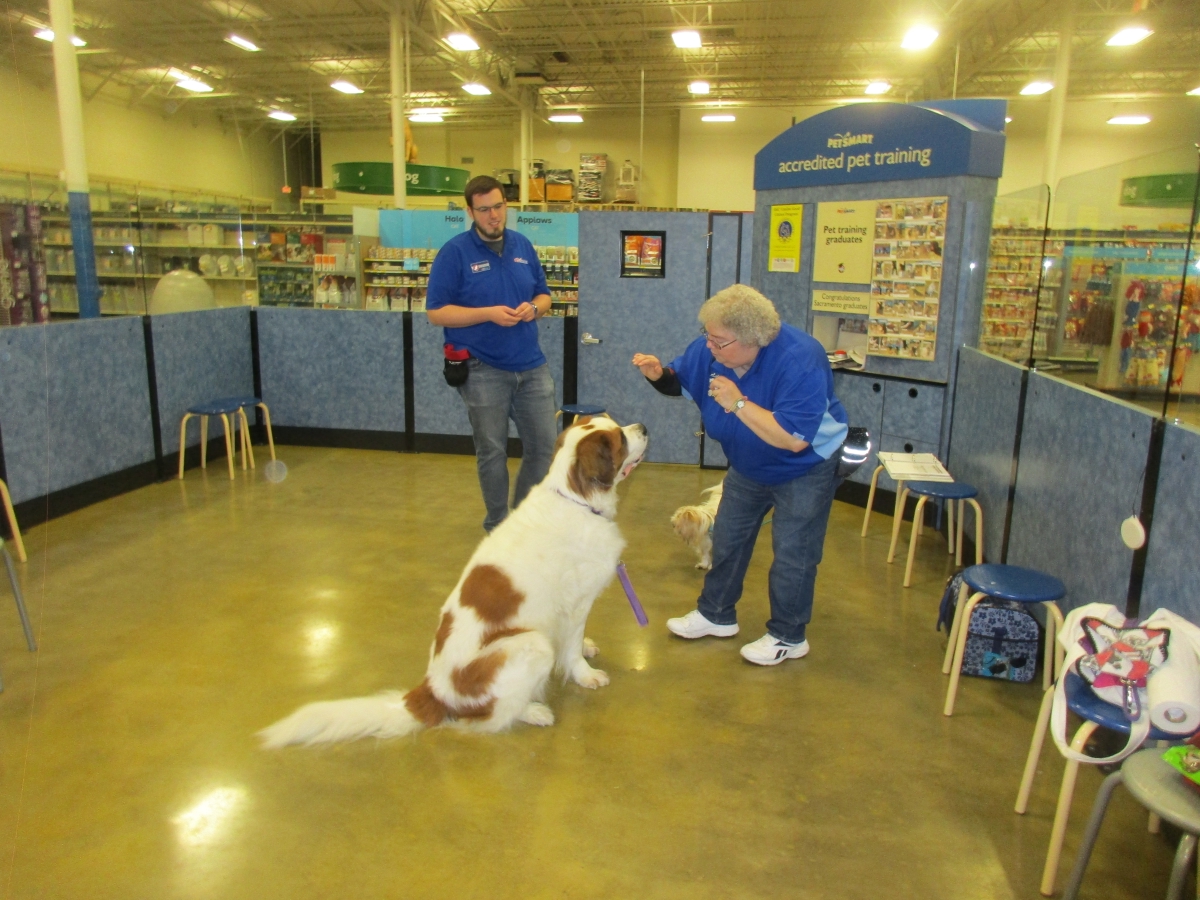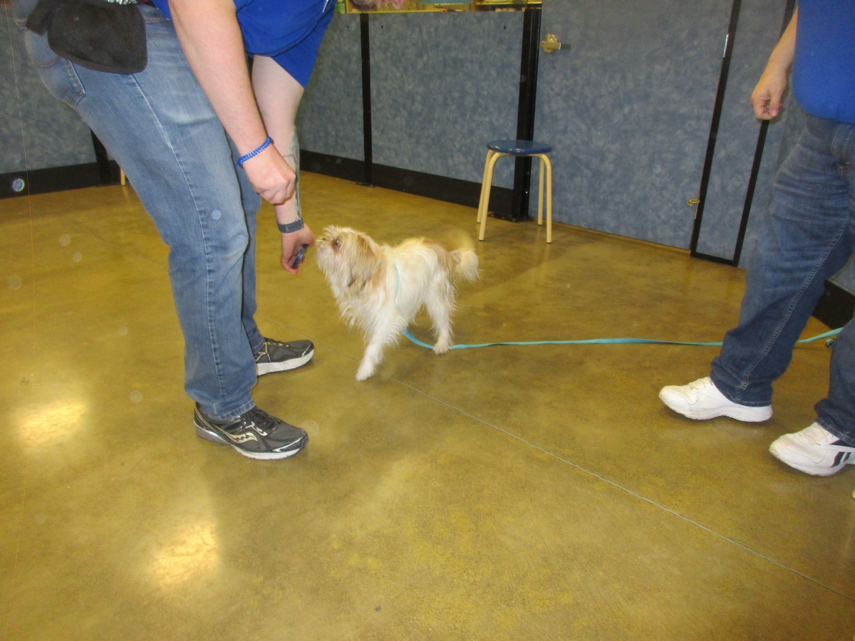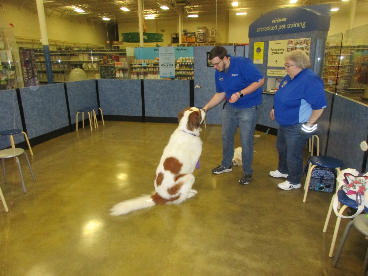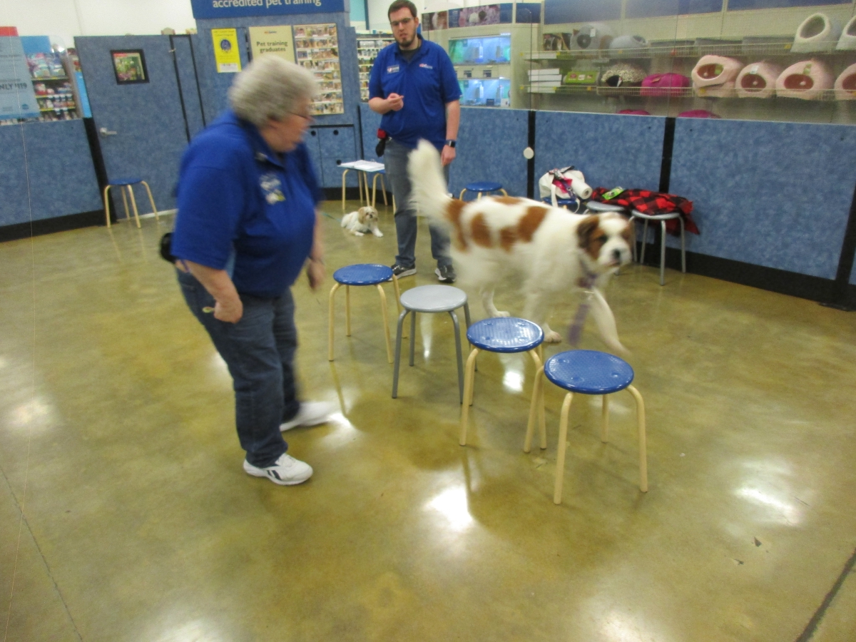 Penny helps Jamie's training of Conner, a new trainer from the Elk Grove Petsmart, in the proper way to train a Click-&-Trick class of pet owners and their dogs...
