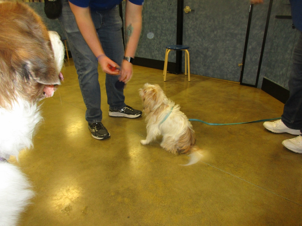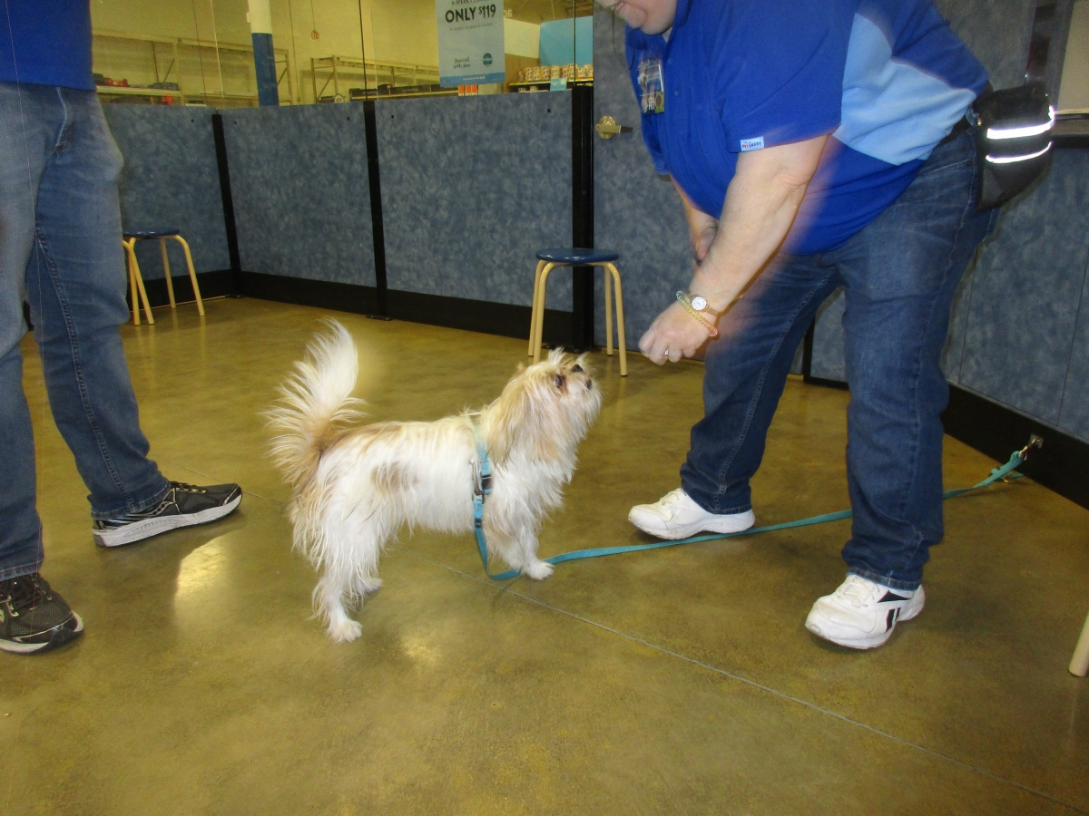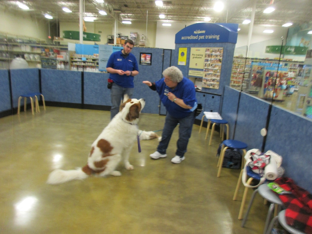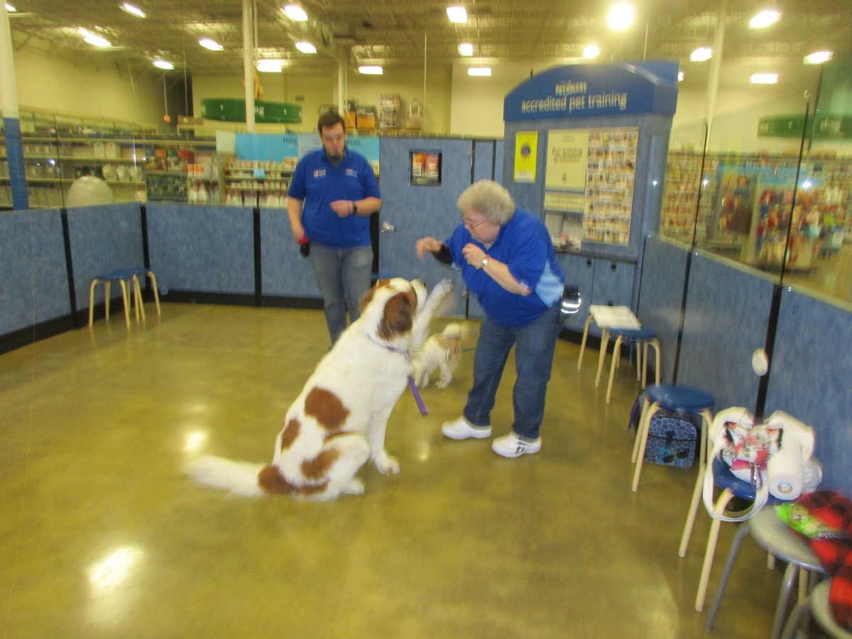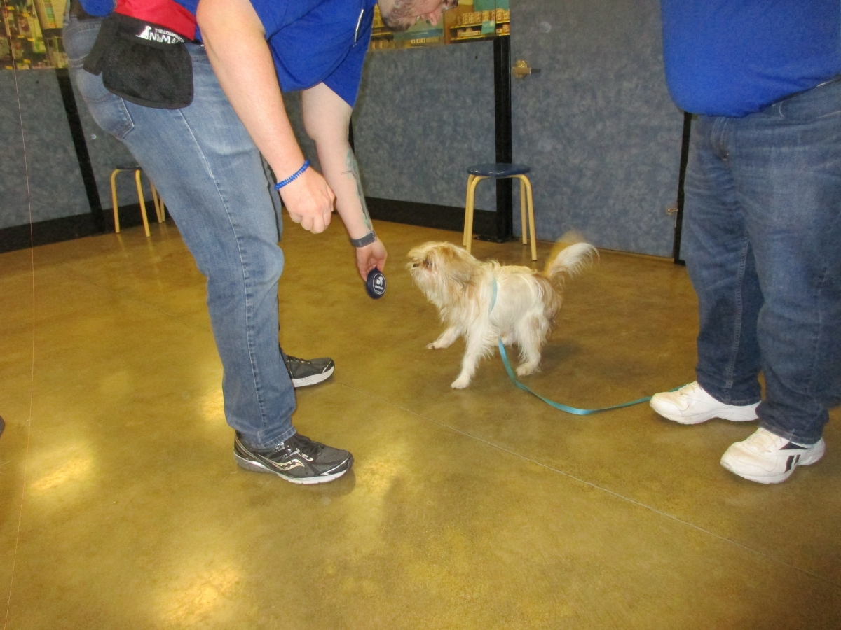 Penny helps Jamie's training of Conner, a new trainer from the Elk Grove Petsmart, in the proper way to train a Click-&-Trick class of pet owners and their dogs...