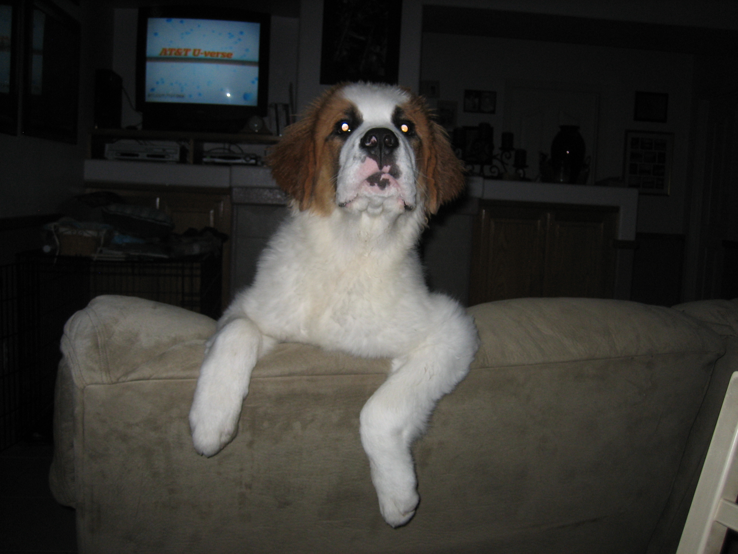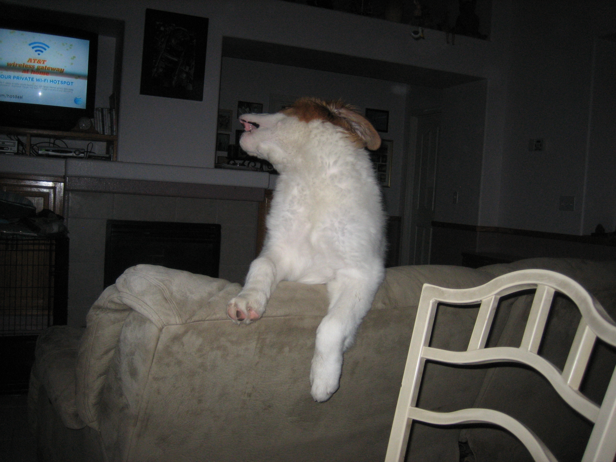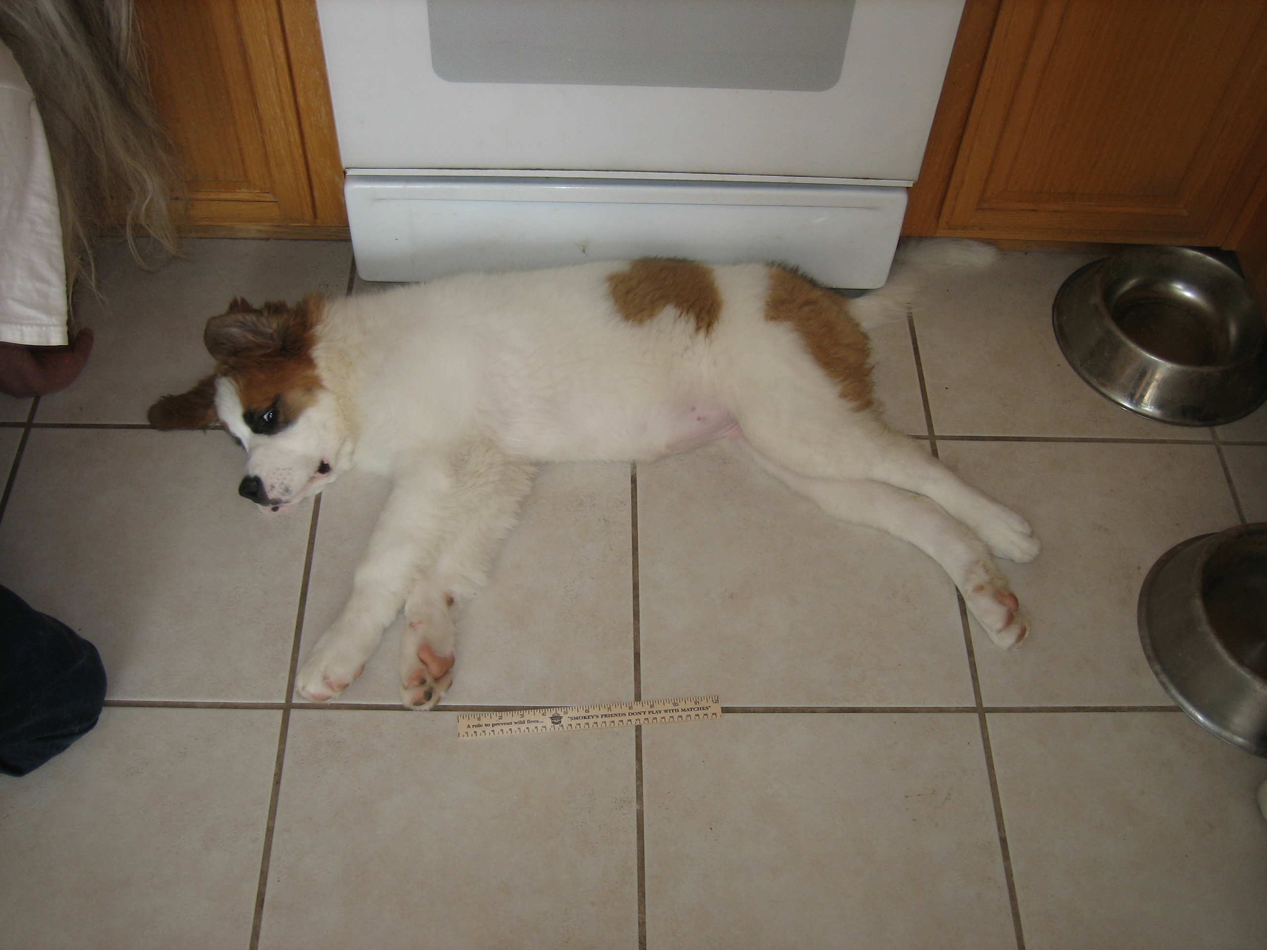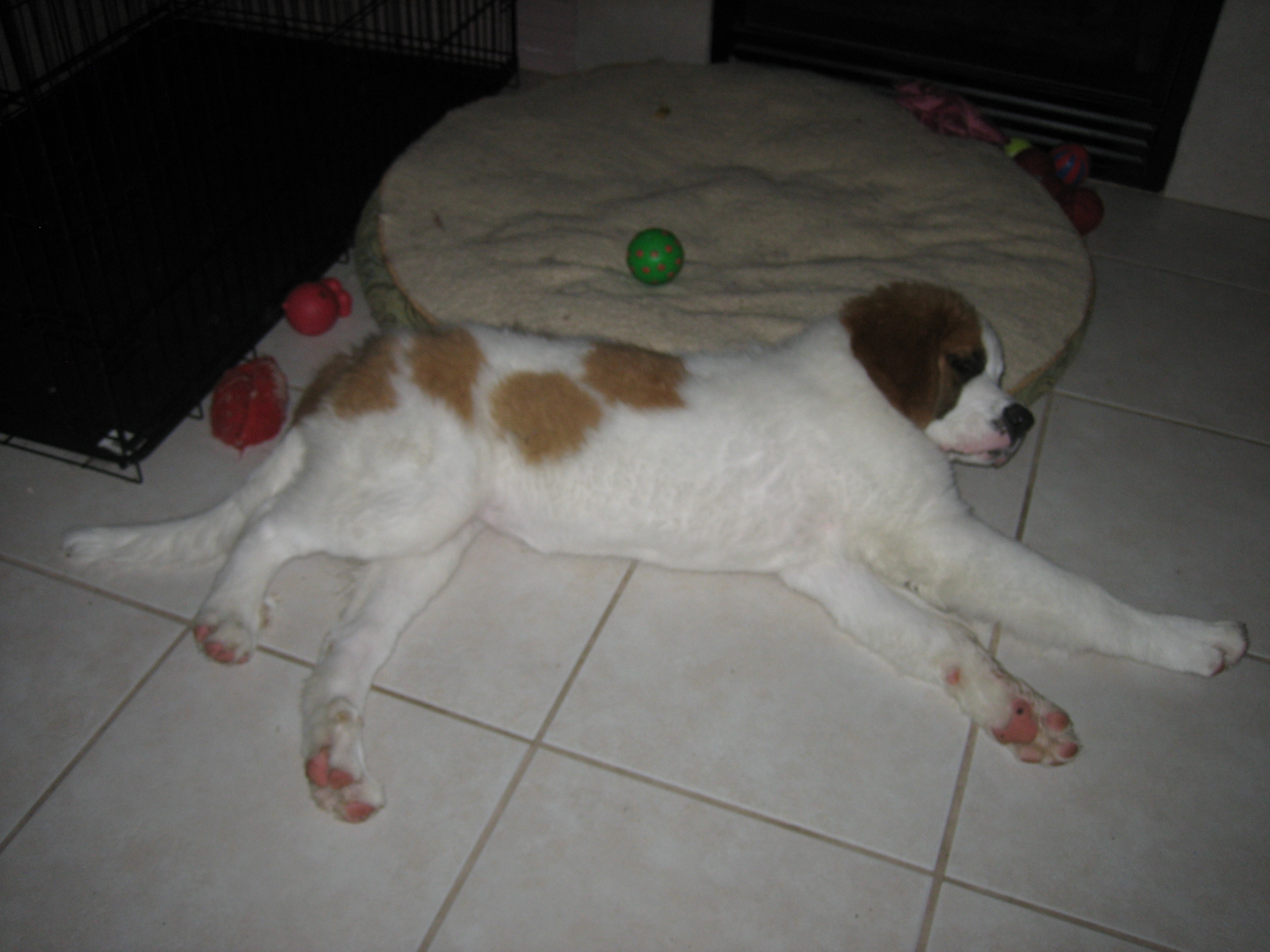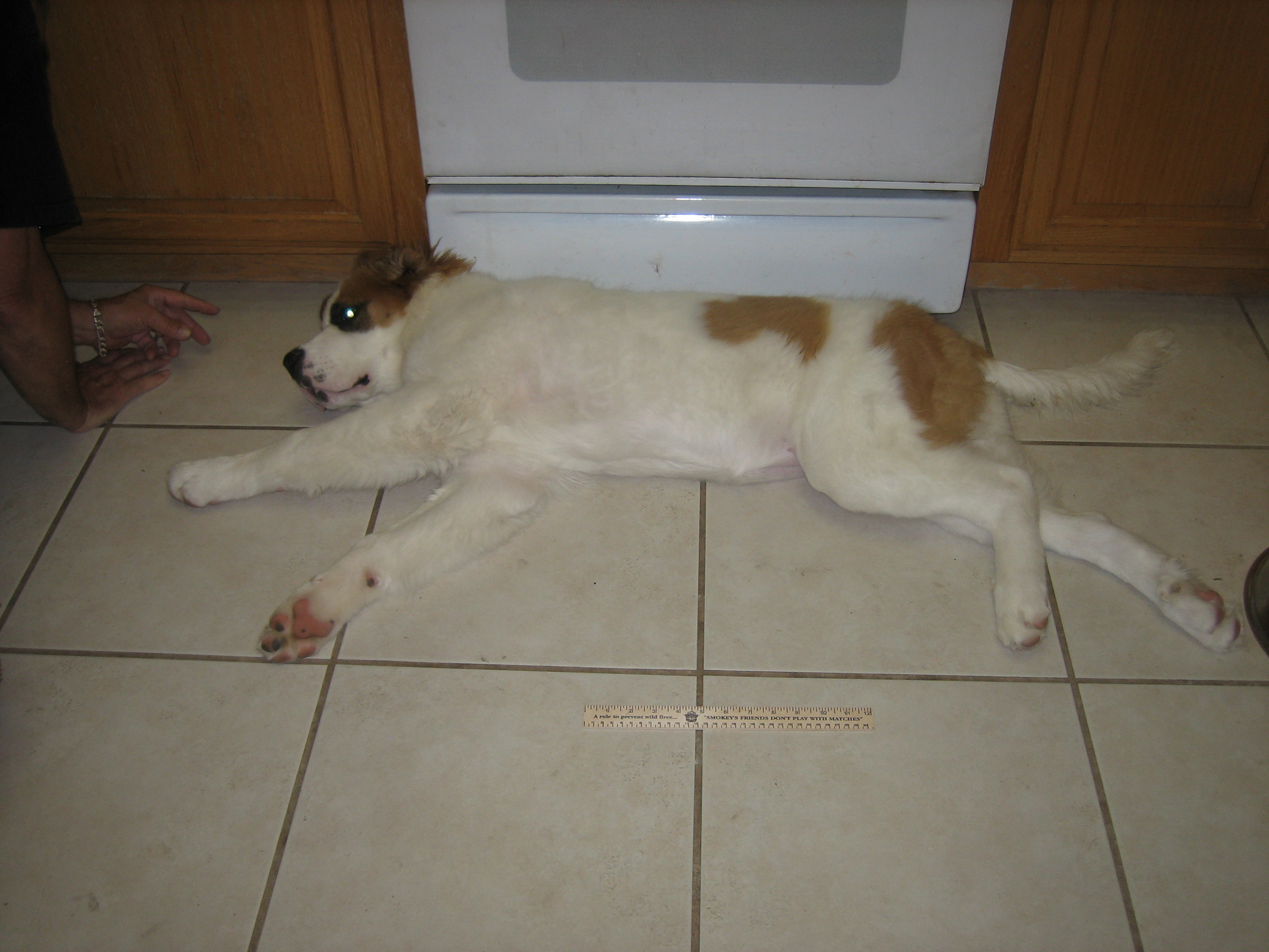 12APR13... to the vet... 44.4 pounds, shots, treats... 14MAR13: 6 toes on the rear...