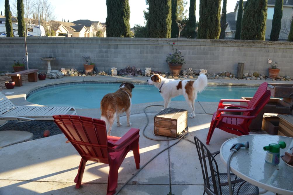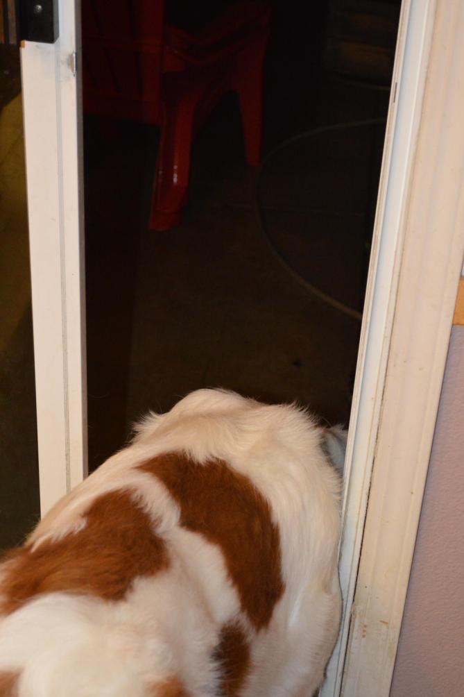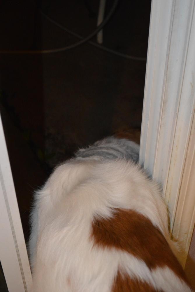11DEC14/Thursday night... RAIN!!!... Penny keeps going to the door... wants to go out and get a drink, but, does not want to get wet... so... stand inside and stick her head out far enough to reach the spigot...